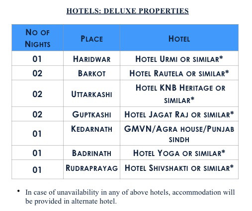 • Accommodation in A/c rooms except in Guptkashi & Uttarakashi.